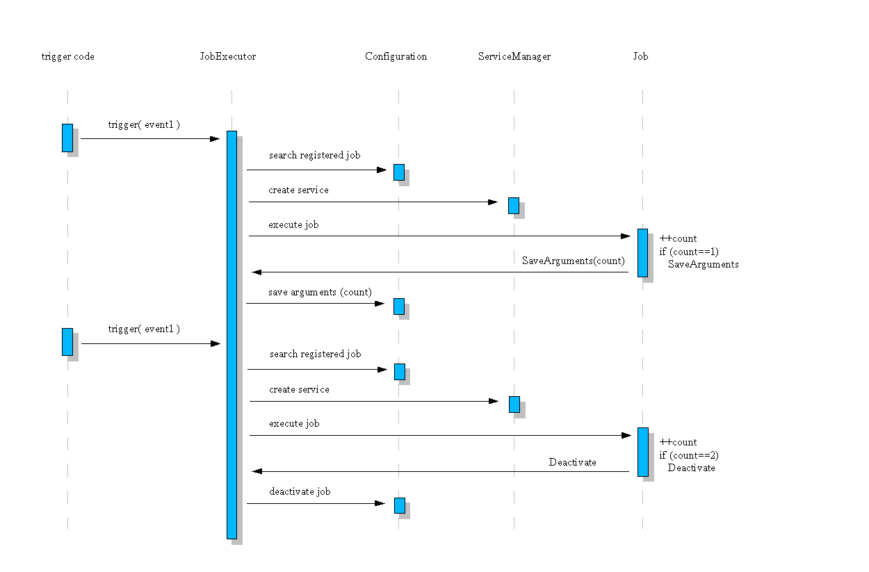 Following sequence diagram shows an example job which is triggered for an „event1“. He gets his own configuration data which includes a „count“ value. The job increased and checked it. In case of „count==1“ he knows that it was the first execution and he invite the job executor to save some configuration data for it – which means especialy the count value. But the job shouldn't be deactivated. If next „event1“ is triggered the job is started again and gets his count information. He found out that it was the second execution and decide to be deactivated from now. He invite the job executor and this service deactivate it inside the configuration.